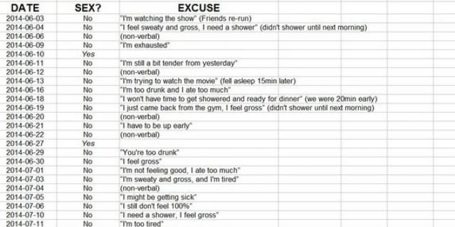 Thus far, the story is not "news worthy" or even uncommon. This husband, however, chose to track married sex with his wife on a spreadsheet for a month (including days he initiated sex, whether she accepted, and "excuses" provided when she declined). He then emailed the spreadsheet to his wife, who was away on business, to inform her of his frustration that she only agreed to have sex 3 times in that month (with 27 attempts on his part). For those interested, here is the chart: