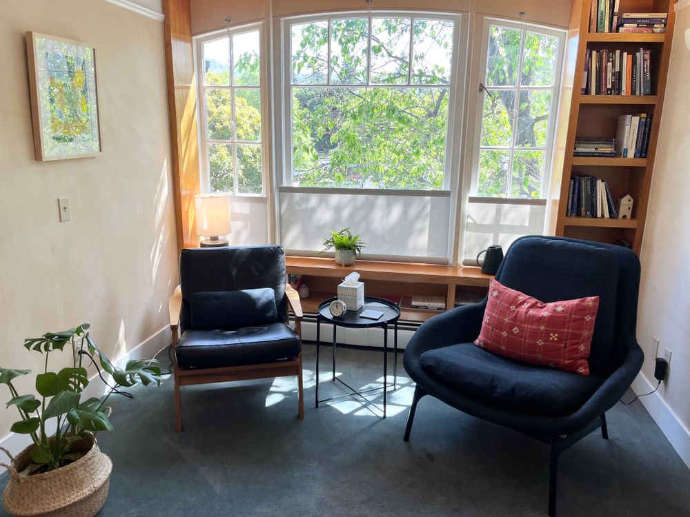 My welcoming office is located in the Rockridge neighborhood of Oakland, offering a calm, private space for our work together. For clients who prefer or require remote sessions, I also offer secure video therapy appointments.