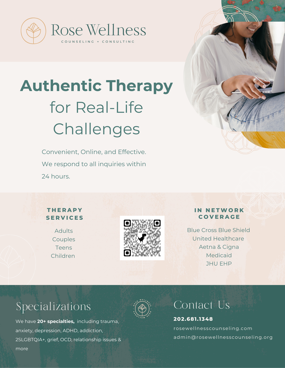 We respond to all inquiries the same day, Monday–Friday before 5 PM! I’m the founder of Rose Wellness, a fully virtual private practice with 24 exceptional therapists. Our English- and Spanish-speaking clinicians specialize in depression, anxiety, relationships, substance use, LGBTQIA+ support, gender-affirming care, and more. Many are trauma-informed, trained in EMDR, and work with children, teens, and adults. While I’m no longer accepting new clients, one of our skilled therapists might be the perfect fit for you! Learn more at www.rosewellnesscounseling.com/team