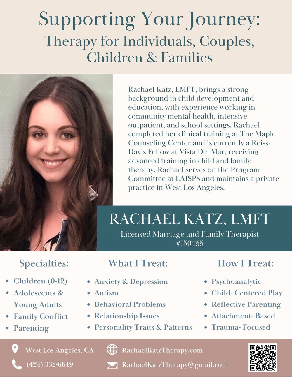 I offer attachment-focused, play-based therapy for children, adolescents, families, and individuals in West Los Angeles. My work supports clients navigating anxiety, emotional regulation, family transitions, and relational stress. Children often communicate their internal world through behavior and play rather than words. In therapy, I use developmentally attuned, play-based approaches to help children express emotions safely, process experiences, and build regulation, while collaborating closely with parents and caregivers in a supportive, non-judgmental way.